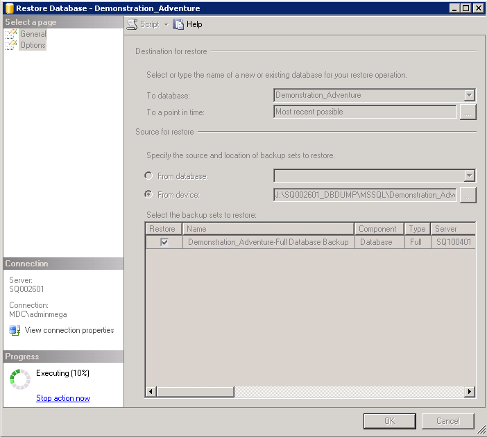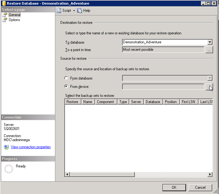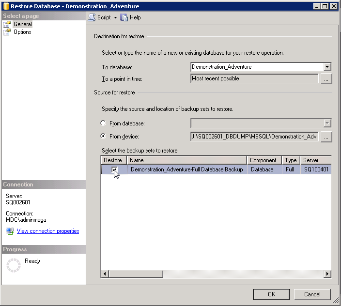 4. From the General page, in the Destination for restore pane, in the To database field, provide the name of the database that will be created (example: Demonstration_Adventure).