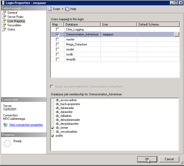 13. Right-click the account that you will use to connect the application to SQL Server (for example: login « megausr ») and select Properties.