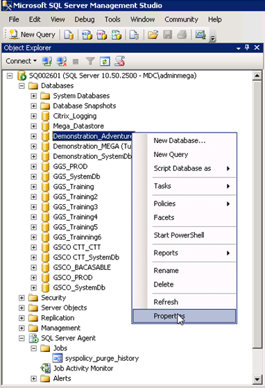 1. Right-click the database and select Properties.