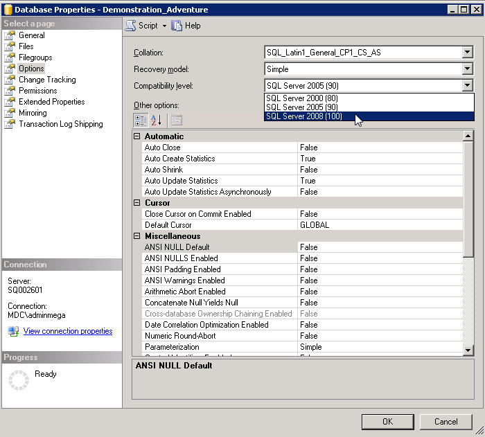 In this example, the source database came from an SQL Server 2005 instance, and was restore on an SQL Server 2008 instance.