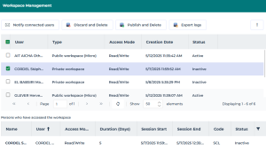 The management page for workspaces currently in progress details the following for each workspace: