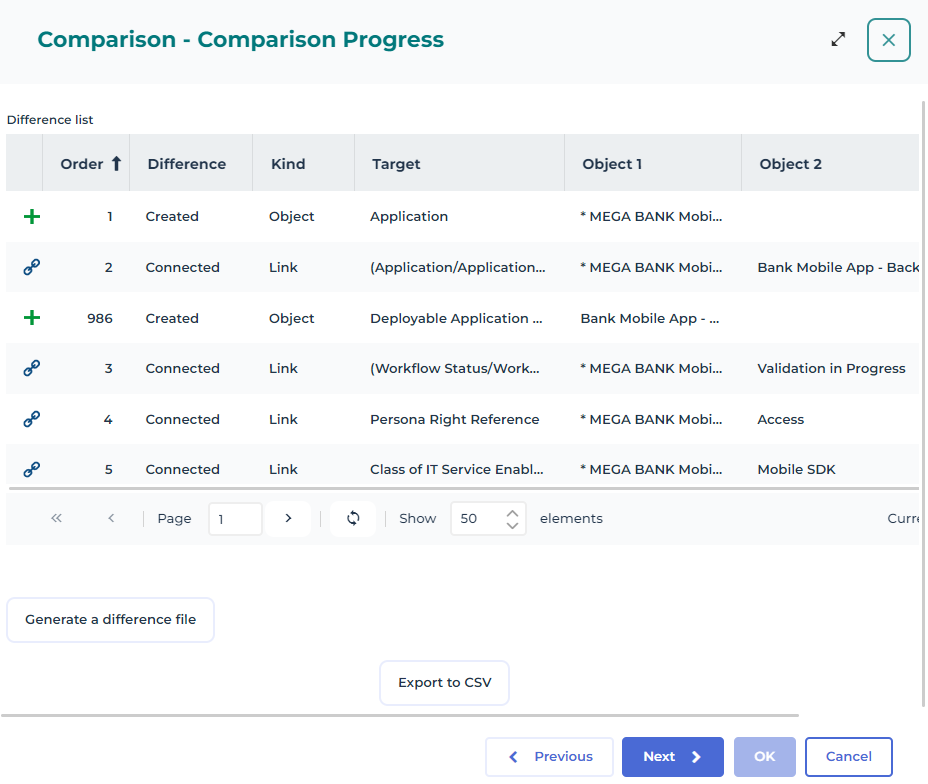 The Comparison Progress window opens. It presents the differences between compared objects and their modifications.