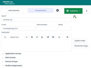 name, writing access area, login, and e-mail address are specified and a profile is assigned to the person.