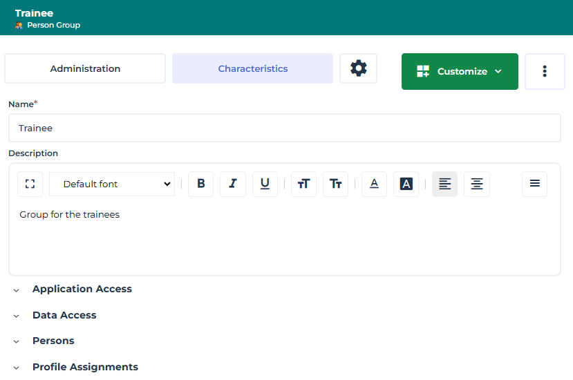 The list of person groups appears with for each group, where necessary, its associated SSO group, and its description.