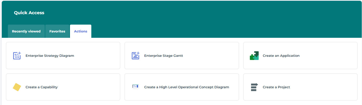 Quick Access contains shortcuts facilitating your work in Hopex UAF.