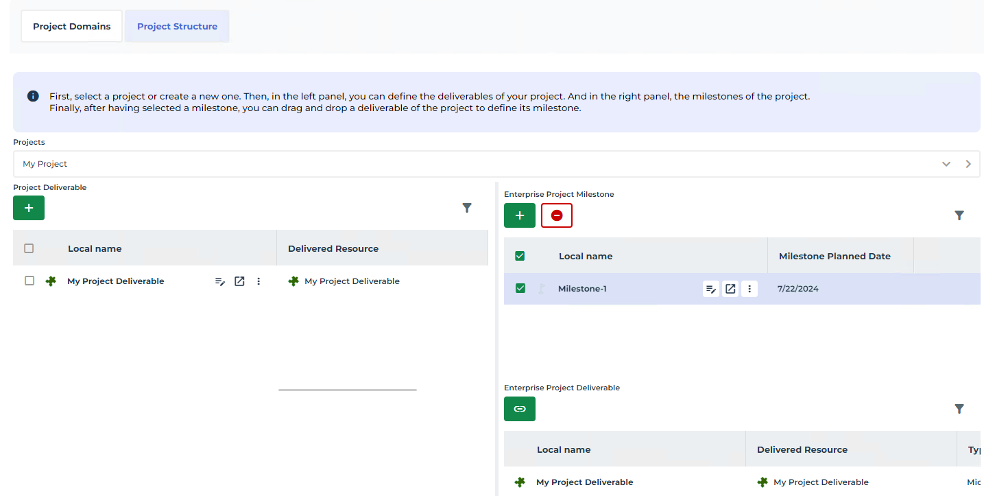 5. Select a Project Deliverables in the left side of the edition area, and drop it in the Enterprise Project Deliverable section corresponding to the selected Milestone.