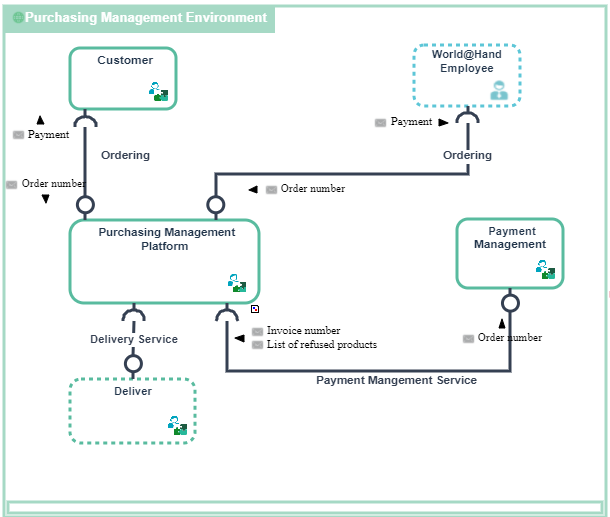 For example, the purchasing requests processing system uses the "Purchasing Management Platform" and "Payment Management" application system services.