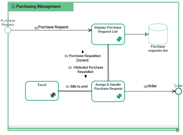 In the Resources view, a Scenario of Flow Diagram can be built for an Application Environment, an Application, an Application System or an Application System Environment. This diagram is used to describe the exchanges inside the described object in a specific context.