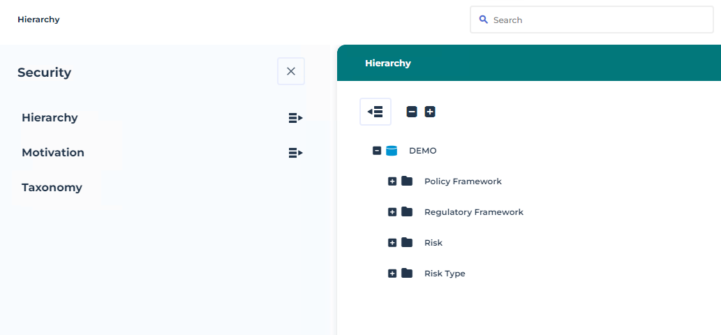 The Hierachy aspect of the Security view helps UAF Architect to access the main security elements.