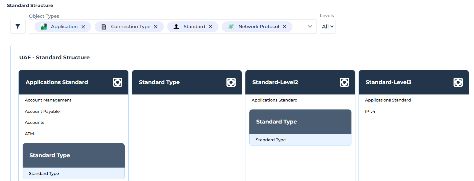 The Structure aspect of the Standards view helps UAF Architect to see the applicability of standards to specific elements in the architecture.