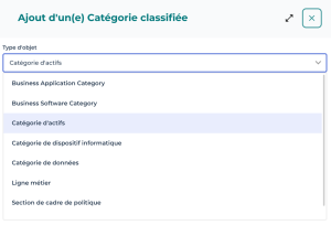 *Le type d'objet Catégorie d'actifs est assez générique pour pouvoir être utilisé sur différents types d'objets. Il en existe d'autres, plus spécifiques, par exemple : catégorie de technologie logicielle, catégorie de dispositif informatique, catégorie d'application métier.