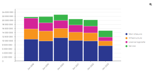 Le rapport des coûts présente les coûts des applications du portefeuille, par nature (main d'oeuvre, infrastructure, etc.) et par année. Il offre différentes vues :