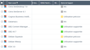 Un MetaAttribut Alerte de support disponible sur chaque technologie compare le cycle de vie officiel d'une technologie (importé de BDNA ou d'IT-Pedia ou spécifié manuellement) avec son cycle de vie dans l'organisation.