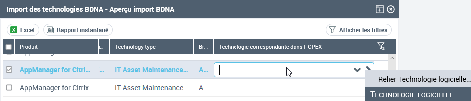 11. (Optionnel) A cette étape vous pouvez fusionner une technologie à importer avec une technologie de votre référentiel. Pour cela, cliquez sur la colonne Technologie correspondante dans Hopex et sélectionnez la technologie de votre référentiel qui correspond à la technologie à importer.