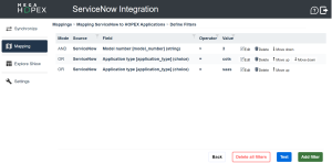 When setting up a mapping, it is possible to specify filters in order to limit the amount of data that will be synced between ServiceNow and HOPEX.