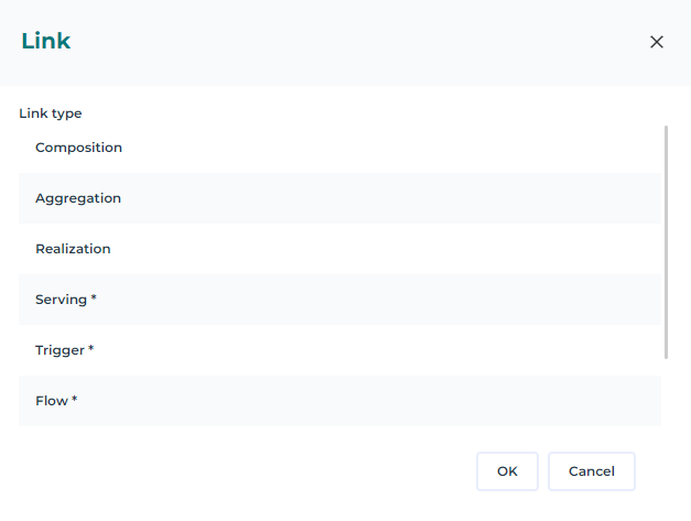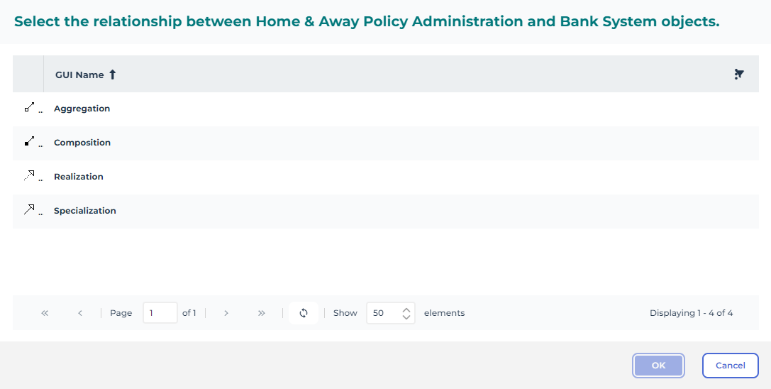 When creating a relationship, a dialog box displays the list of possible relationship types available between the two elements in the current viewpoint.