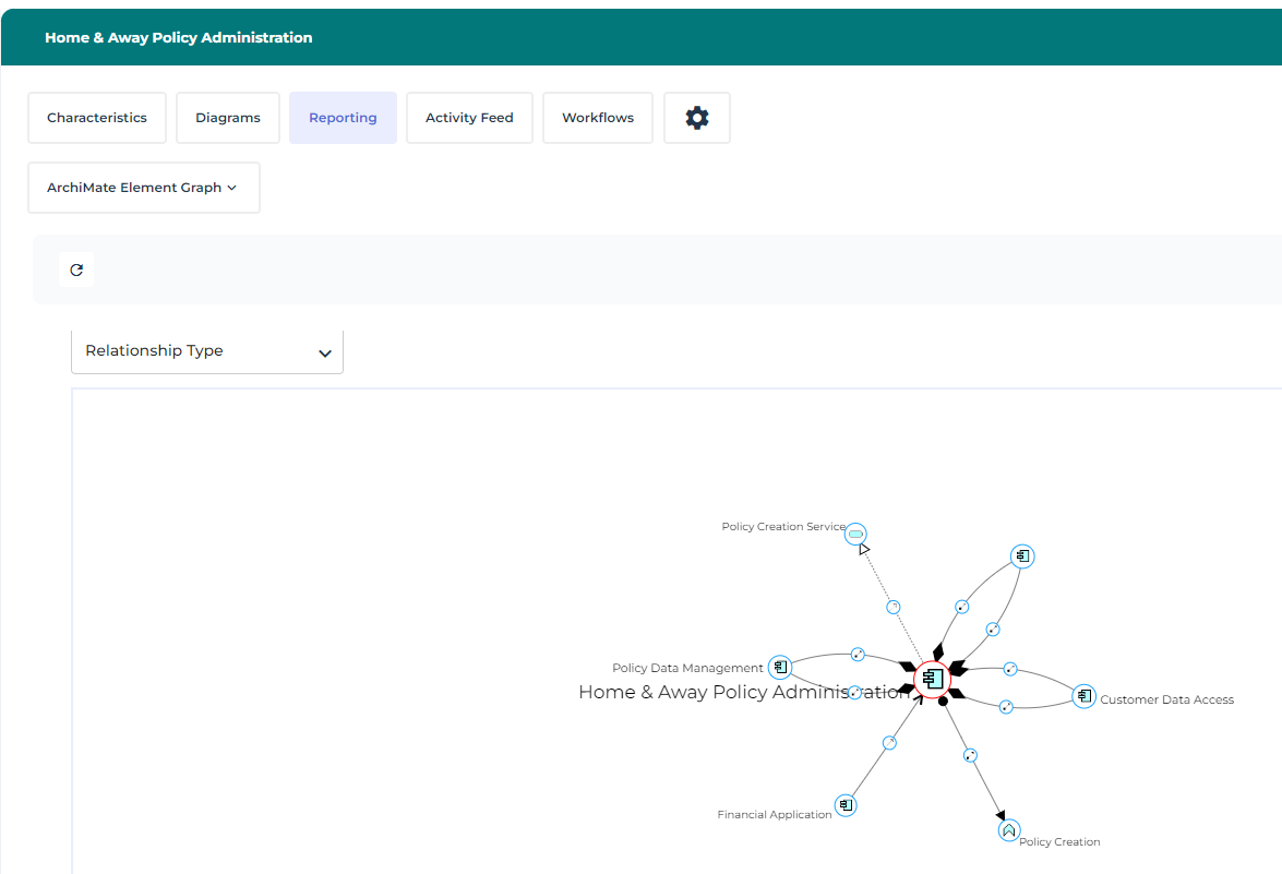 • An embedded report can be accessed from the Reporting property page of an element. All in/out relationships of the element can be browsed and filtered by relationships type.