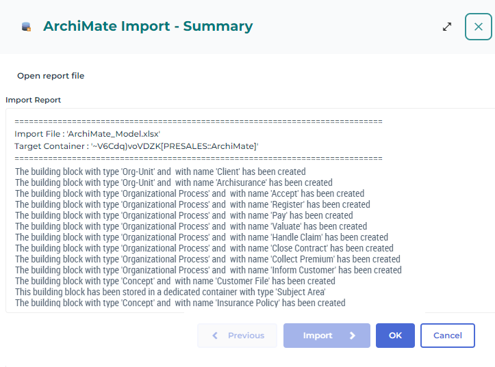 ArchiMate® design can be serialized into an xml file that supports the standard objects and diagrams. The HOPEX for the ArchiMate Framework import aims at importing ArchiMate® Models from files so that architectures modeled in other ArchiMate® modeling tools can be reused by HOPEX.