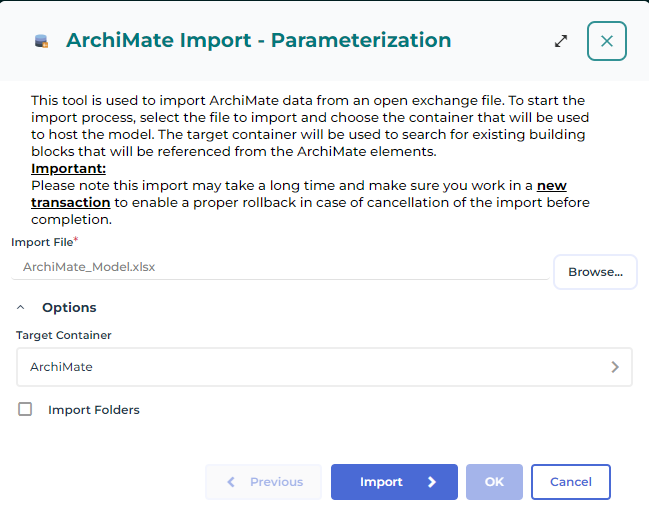 2. In the Import File of the ArchiMate Import - Parameterization dialog box, specify the path of the file to be imported.