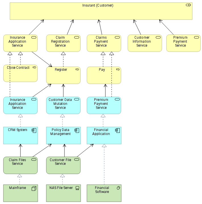 The service realization viewpoint is used to show how one or more business services are realized by the underlying processes (and sometimes by application components). Thus, it forms the bridge between the business products viewpoint and the business process view. It provides a “view from the outside” on one or more business processes.