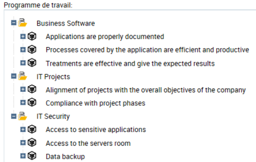 A partir de cette arborescence, l'auditeur peut créer des fiches de travail, constats et recommandations. Pour plus de détails, voir