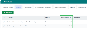 Dans les propriétés d'un plan d'audit, la page Audits permet de visualiser l'avancement des missions d'audit.