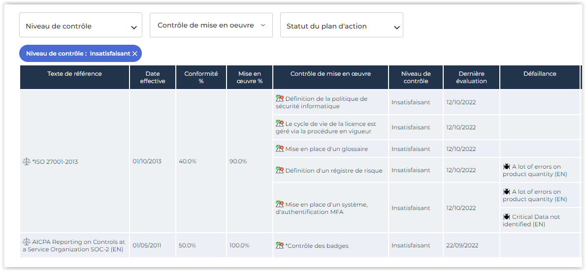• le % de conformité : pourcentage de contrôles satisfaisants sur le nombre de contrôles reliés aux obligations du texte de référence.
