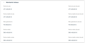 La section Montants totaux calcule automatiquement la somme de tous les éléments financiers liés à l'incident (pertes, gains, récupérations et provisions).