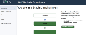 From the Staging environment, you can schedule a Move to Production, which will be executed only after validation in the Production environment.