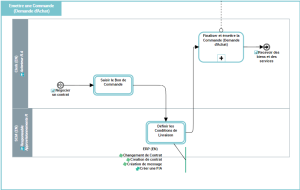 Dans cet exemple de diagramme de processus, le processus amont "Négocier un contrat" est affiché au niveau de l'événement de début et le processus aval "Recevoir des biens et des services" est affiché au niveau de l'événement de fin.