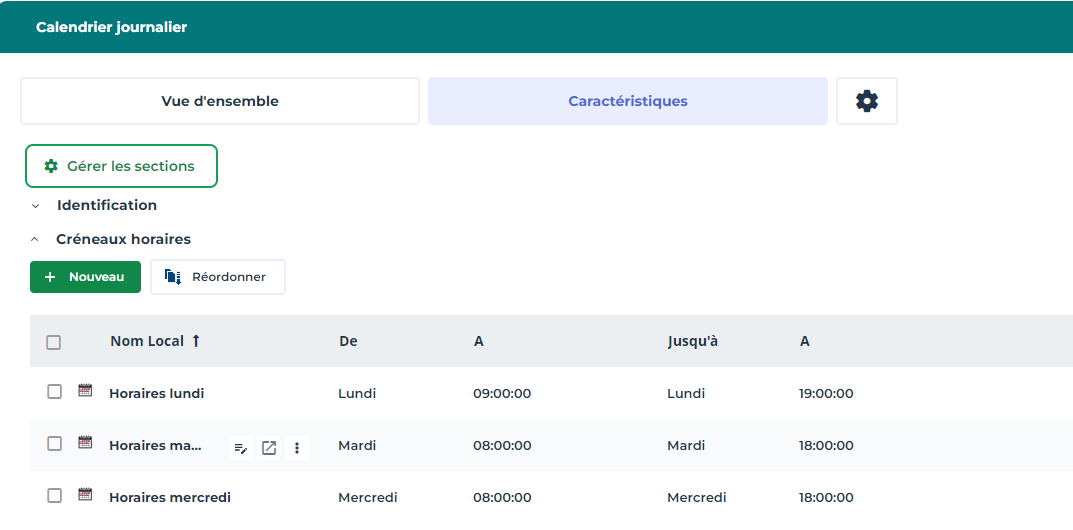 Vous pouvez créer un calendrier pour indiquer qu'un type d'employé travaille les lundis de 9h à 19h ainsi que les mardis et mercredis de 8h à 18h.