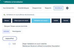 Le concepteur de processus reçoit une notification de validation. Le processus reste verrouillé (ainsi que le diagramme correspondant, sa description et ses composants). Une révision du processus est créée automatiquement, voir
