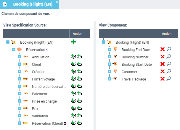 • la partie gauche présente l'ensemble des composants du concept source de la vue, tels que définis dans le dictionnaire de données