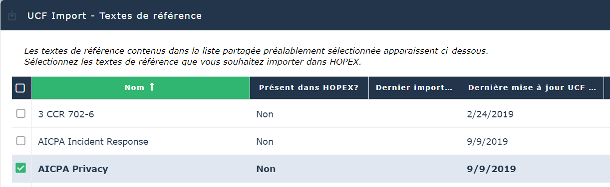 Dépliez l'arborescence et sélectionnez la case correspondant aux textes de référence / articles / sections auxquels vous devez vous conformer.