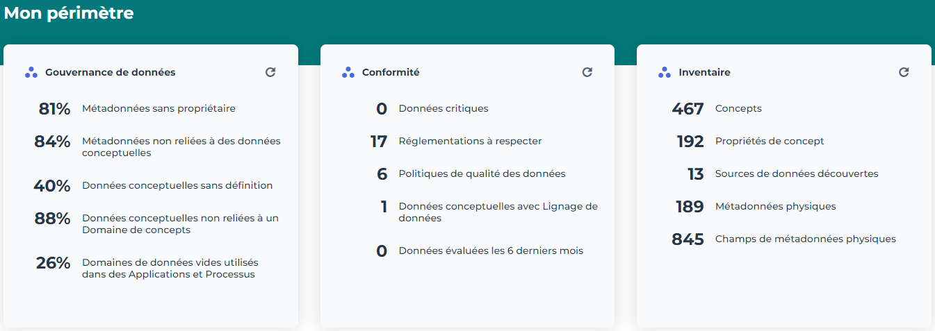 Mon périmètre présente des indicateurs utiles sur le contenu du référentiel. Voir ci-dessous