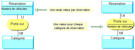 Si le nombre de véhicules est porté par l'entité "Réservation", on ne peut indiquer que le nombre total de véhicules pour une réservation. On doit donc faire une réservation par catégorie de véhicule loué (cardinalités 1,1).