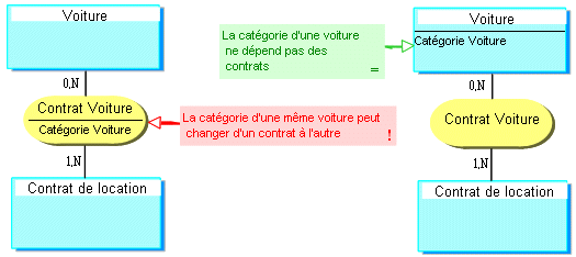 Si le "Tarif Catégorie" est porté par l'entité "Voiture", cela signifie que deux voitures de la même catégorie peuvent avoir un "Tarif Catégorie" différent. Pour éviter cela, il faut créer une entité "Catégorie" qui portera le tarif.