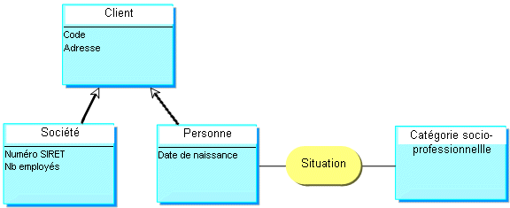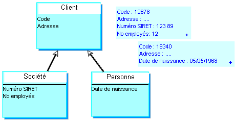 Dans l'exemple ci-dessus, les propriétés, les associations, les rôles et les contraintes spécifiés pour "Client" sont aussi valables pour "Client important".