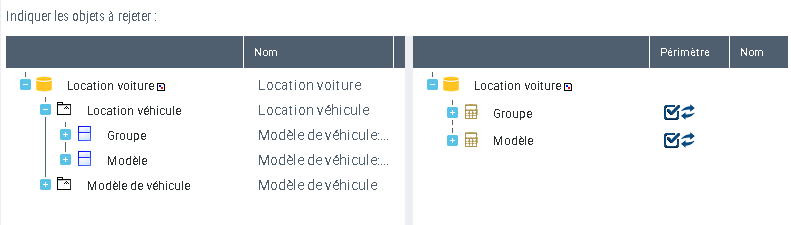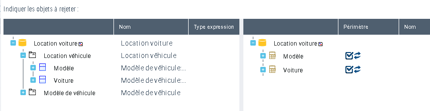 L'entité "Voiture" quant à elle n'est pas prise en compte dans le périmètre car elle ne peut pas agir sur la table "Modèle".