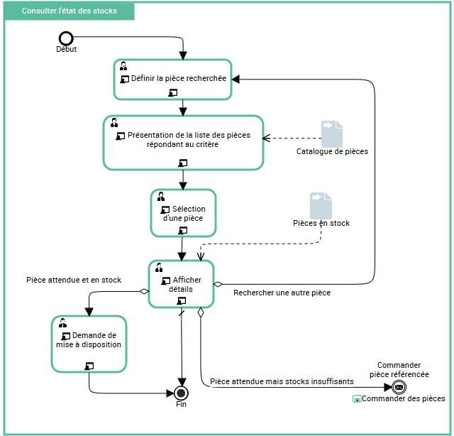 Un diagramme de processus applicatif permet de spécifier l'enchaînement des tâches à réaliser de manière à ce que l'utilisateur puisse vérifier que l'application décrite réponde à son besoin.