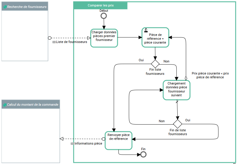 Quand la liste complète des fournisseurs a été analysée, les informations concernant la pièce de référence sont envoyées vers le service "Calcul du montant de la commande".