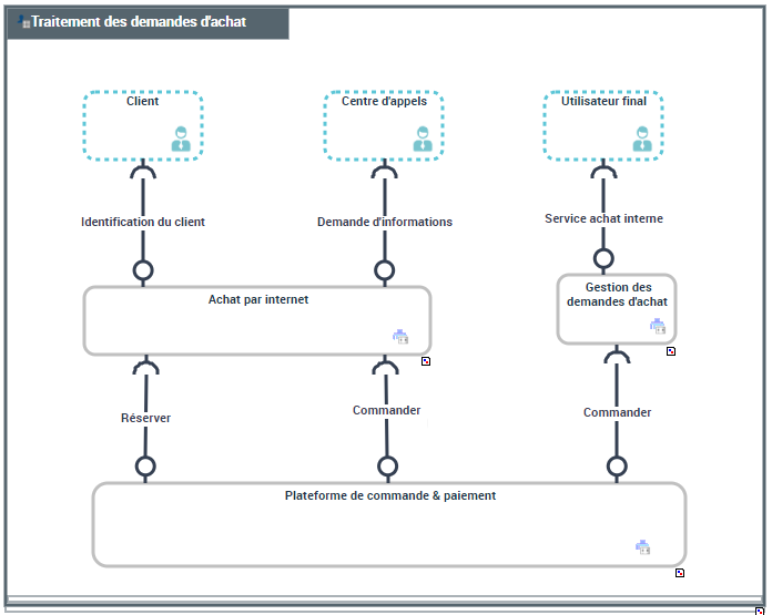 Le diagramme de structure de système applicatif logique, chargé de gérer les “Gestion des demandes d'achats” présente différentes applications logiques, un accès à une base de donnée logique ainsi que des points de service et de requête pour “Service achat interne” ou “Commander”.