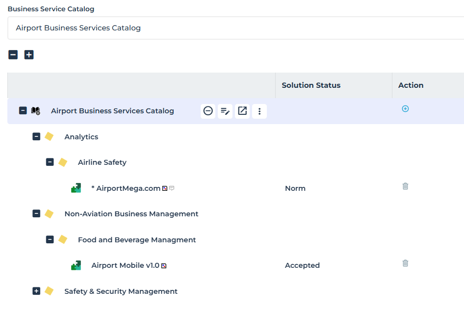 La présentation ci-dessus d'un catalogue de services métier permet d'identifier les capacités métier associées aux services, les solutions techniques qui mettent en œuvre les capacités et le statut de ces solutions dans le contexte d'utilisation du catalogue.