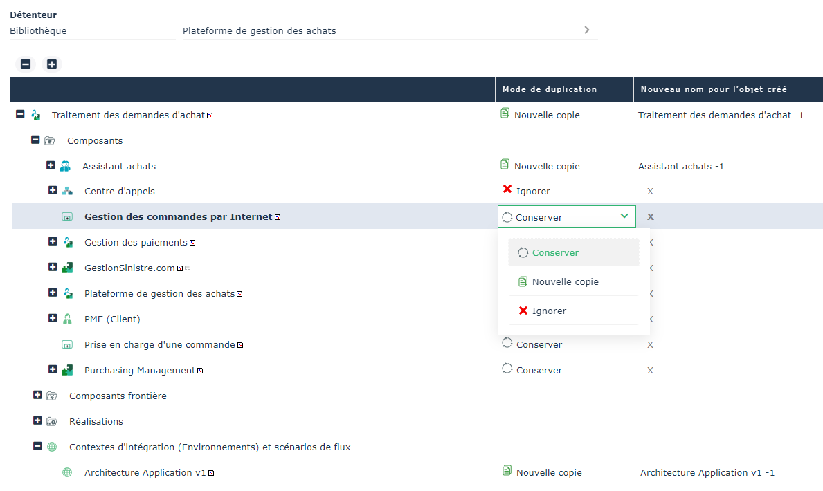 • Créer une Nouvelle copie du composant sélectionné. Dans ce cas, le nom du nouveau composant apparaît dans la colonne Nouveau nom pour l'objet créé.