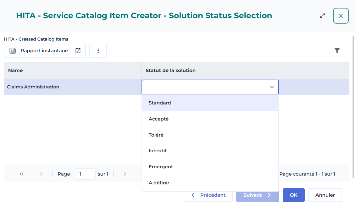 Une nouvelle page s'ouvre afin de spécifier le statut de l'objet qui représente la solution dans le contexte du catalogue de services.