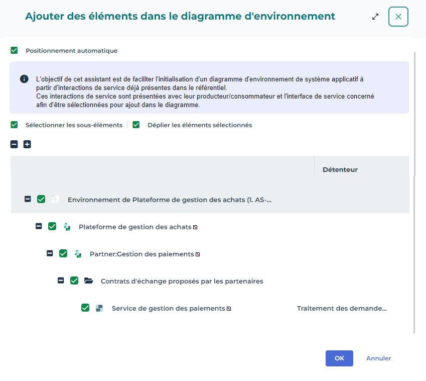 Afin de faciliter la description d'un contexte spécifique d'utilisation d'un système applicatif, par exemple, le bouton Ajouter des éléments vous permet de dresser la liste des composants avec lesquels le système applicatif interagit et de sélectionner ceux que vous souhaitez représenter dans votre diagramme d'environnement.