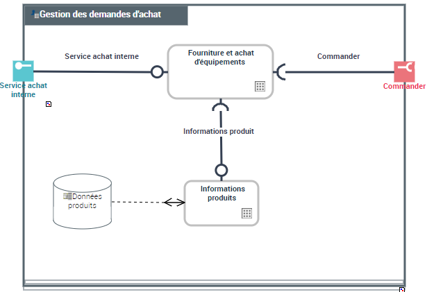 Le diagramme de structure de système applicatif logique, chargé de gérer les “Demandes d'achats par Internet” présente différentes applications logiques, un accès à une base de donnée logique ainsi que des points de service et de requête pour “Réserver” ou “Commander”.