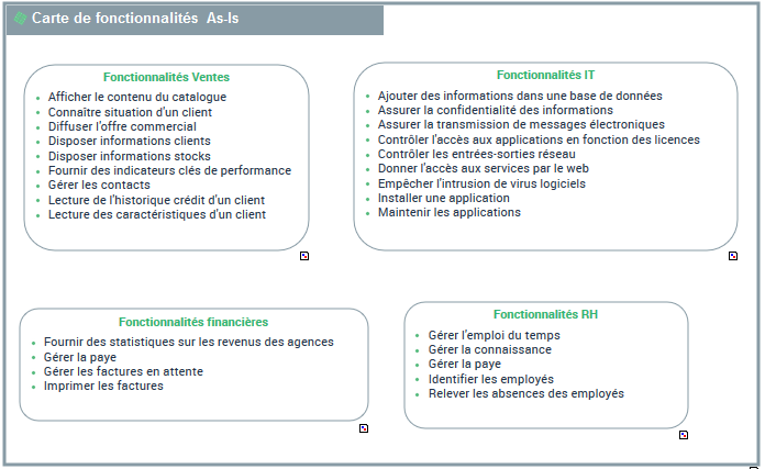 Une carte de fonctionnalités permet de décrire l'ensemble des fonctionnalités que l'entreprise est capable de couvrir pour ses besoins internes ou pour répondre aux attentes de ses clients.