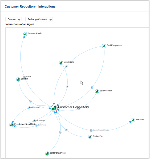 Ce rapport de type «graphe» présente une synthèse des interactions de service auxquelles participe un agent (Système Applicatif, Application, Service Applicatif, Microservice, etc.) sélectionnés par l'utilisateur.