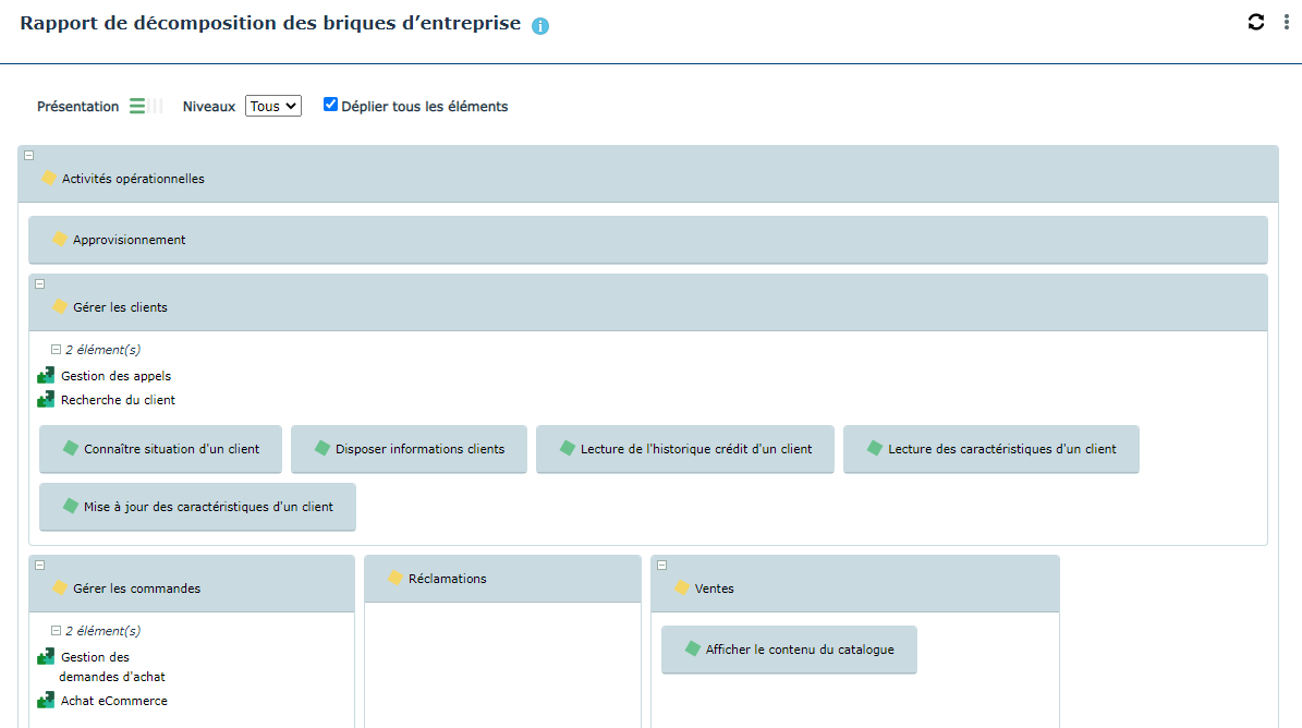 Vous pouvez utiliser ce rapport pour visualiser la couverture de réalisation des éléments des capacités métier par des éléments opérationnels tels que des applications logiques et physiques, des systèmes applicatifs, etc.